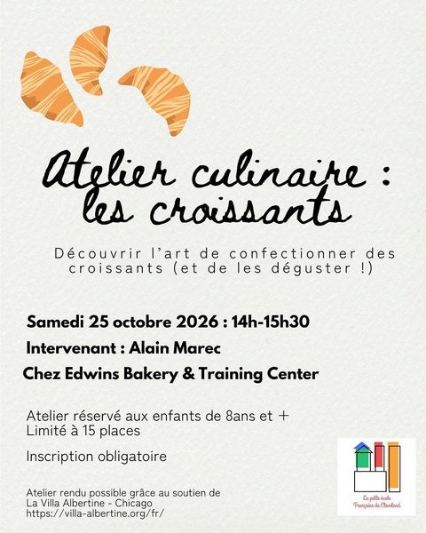 A cultural workshop for children aged 8 and up, where they'll learn how to make croissants with a retired French baker. The workshop will take place at Edwins Bakery & Learning Center, from 2:00 to 3:30 PM.