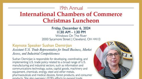 The British-American Chamber of Commerce cordially invites everyone from Ohio's community of local and international business professionals, civic leaders, and government representatives for the Annual International Chambers Christmas Luncheon. We are honored to have Sushan Demirjian, Assistant United States Trade Representative for Small Business, Market Access, and Industrial Competitiveness, as our keynote speaker.
