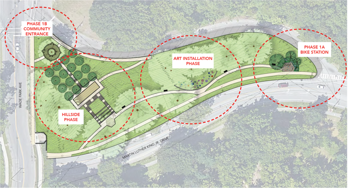 Arguably the most intensive phase of the project, phase 2 involves landscaping the hillside to add multiple classic French spaces. The hillside area will start with a hexagon stage to allow a place for live music, speeches, and other public performances in front of open amphitheater seating.