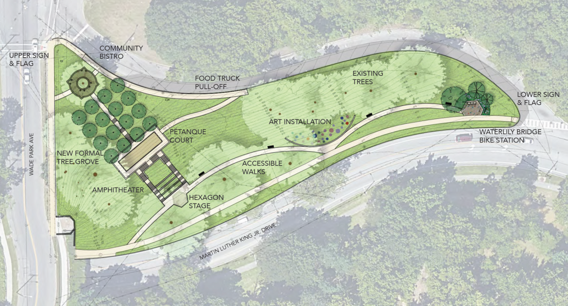 People can either hang out in the amphitheater or take the stairs up to the terrace. This terrace will be home to the petanque court, a classic French sport similar to bocce, giving the community a place to play games or hold events while overlooking the stage area. A formal tree grove of either European Hornbeams or London Planes – two trees common in France – will sit behind the terrace, creating an idyllic pathway connecting the walkways along Martin Luther King, Jr. Drive and the community entrance.