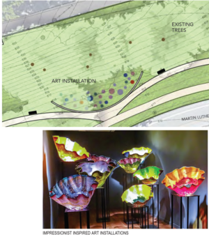 This part of the garden will serve as a nod to both the Tour de France and Monet’s impressionist works. The structure will be colored to match Monet’s famous painting “The Water Lily Pond” and serve as a bridge from the rest of the gardens into our space. Meanwhile, the bike station will include a repair station and bike storage area for anyone riding along the Cultural Gardens to enjoy.