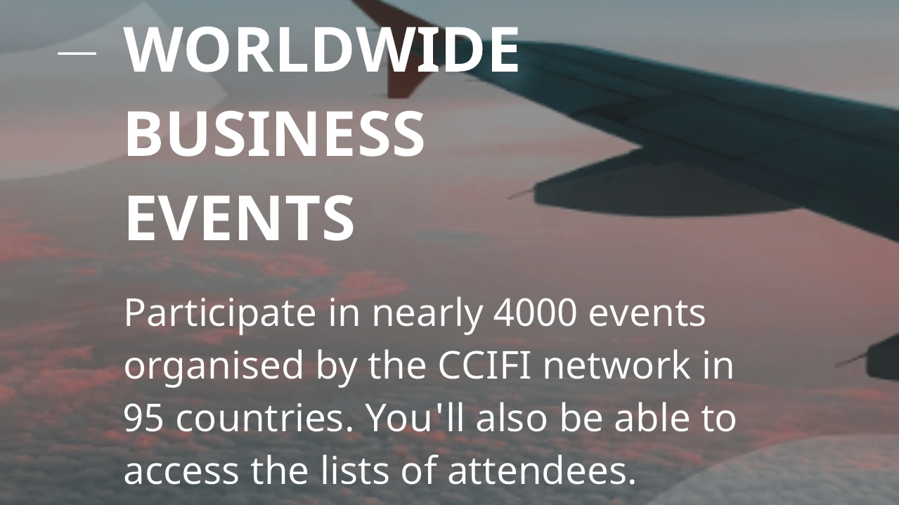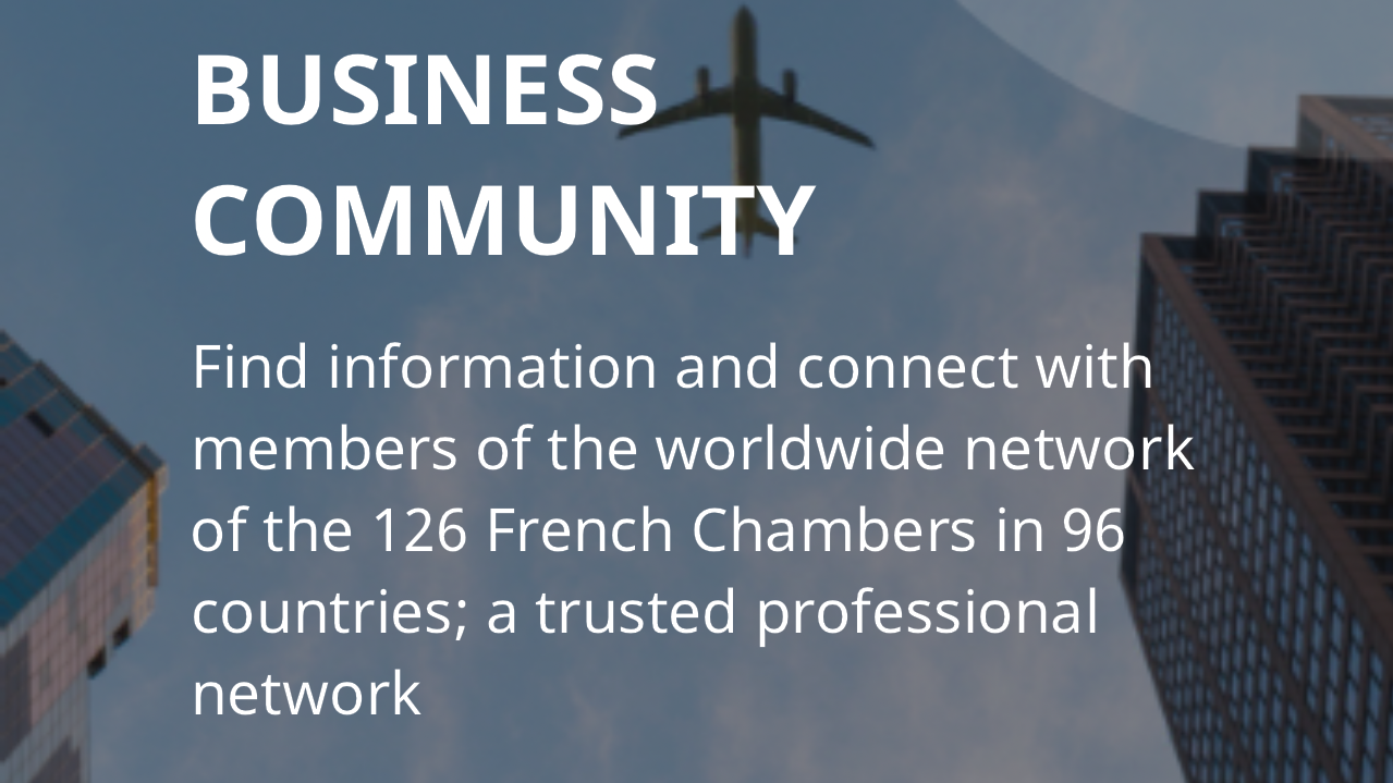 Accelerate your business with the first private network of French companies in 95 countries: 120 Chambers | 33,000 companies | 4,000 events | 300 committees | 1,200 exclusive privileges